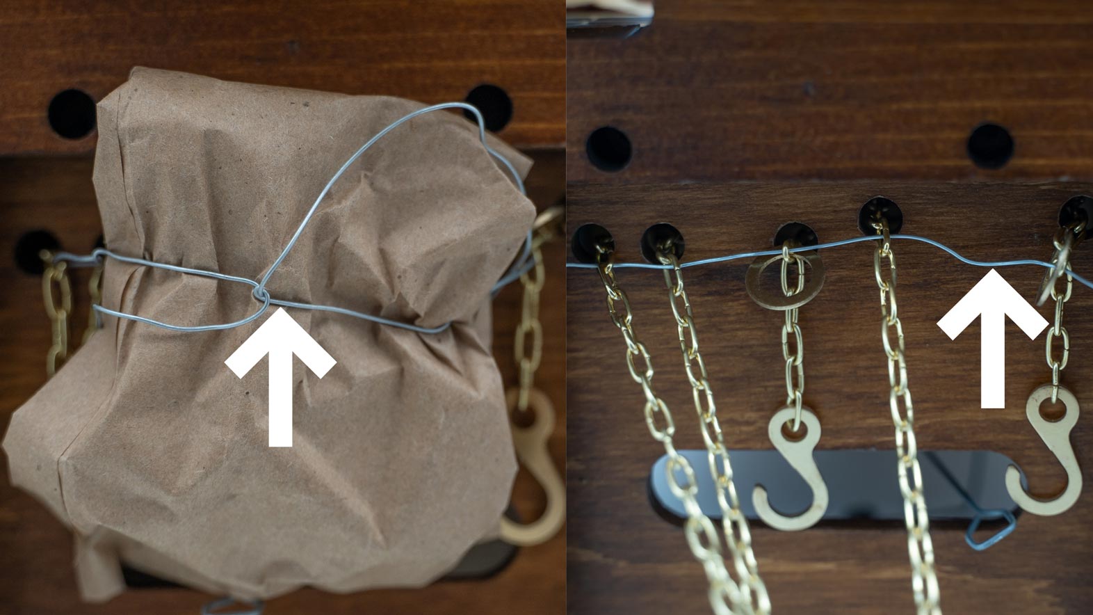 To send a clock to a service station, pull the chains so the hooks are under the case. Insert a piece of string, wire or a twist wrap through all the chains “close as possible to the case bottom.” Bundle up the chains in a piece of aluminum foil and tie up tightly with a rubber band, tape or string. This prevents the chains from coming off the wheels, and creating a snarled mess of chains inside the clock.